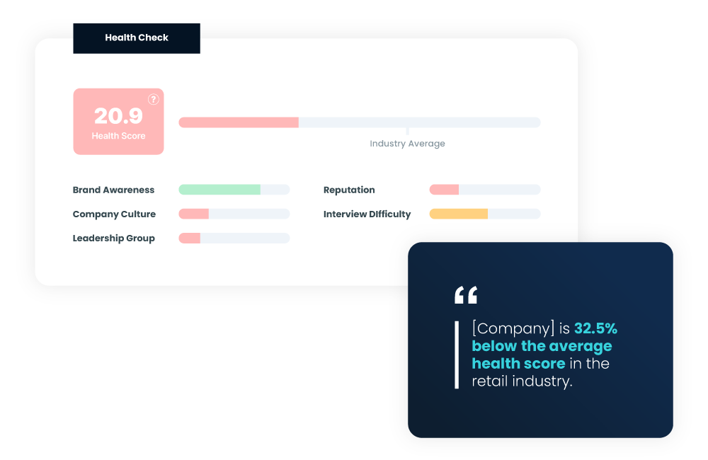 InterviewPrep helps you calculate a health score for any company in the world. This data is pulled from a weighted combination of their overall digital reputation, active leadership team, and company culture.